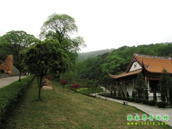 轉(zhuǎn)到祠堂后邊,有一短坡,草色蒼綠,雜有香楓,高不及數(shù)尺。右有一潭,約五尺圓盤,潭水清澈,右岸樟樹兩棵,挺撥林立,樹旁瀑布寬約兩尺,高約兩人,水沫飛濺,水擊聲轟轟,如約大壩泄洪。潭之左邊,有一石梯,拾級而上,就見岳麓山上煙雨蒙蒙,那濃濃的霧水,就像一個(gè)打扮得漂漂亮亮的姑娘披上潔白的婚紗——更加?jì)趁膭?dòng)人。