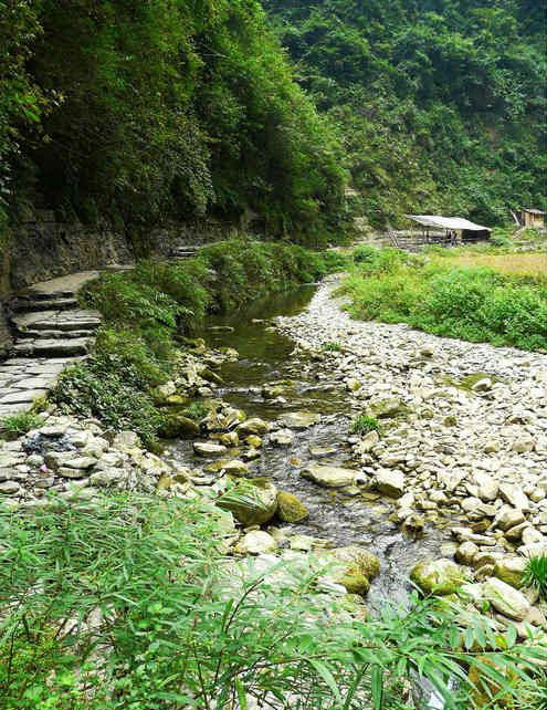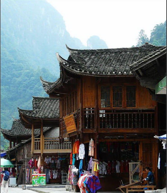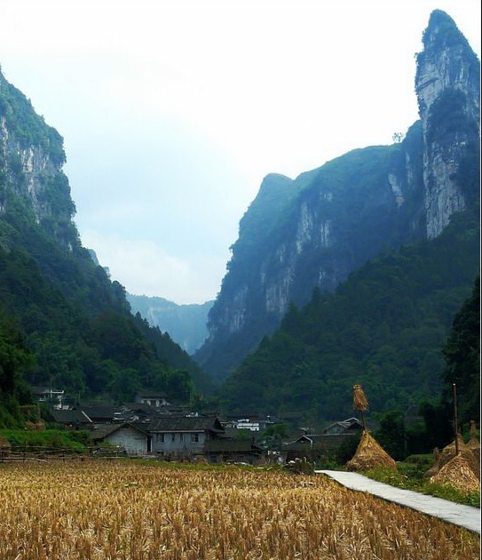 村寨四周山勢(shì)雄奇,絕壁夾天;“夯峽”、“九龍”、“玉泉”三溪在這里相會(huì),如同三根彩帶在這里相交結(jié)。這里是風(fēng)景區(qū)的中心,一萬五千多米長的青石板路從這里一直通向各個(gè)景點(diǎn)這里還是一個(gè)角度十分好的觀景臺(tái),人立于此,只要原地轉(zhuǎn)動(dòng)身子,就可觀賞到東西南北全方位的各個(gè)景點(diǎn),那含情脈脈的“相依巖”、昂首奮蹄的“駟馬峰”、惟妙惟肖的“孔雀開屏”五彩繽紛的“彩云壁”和“畫屏峰”……盡在眼中無不景象萬千,令人目不瑕接。詩人石元機(jī)贊曰: