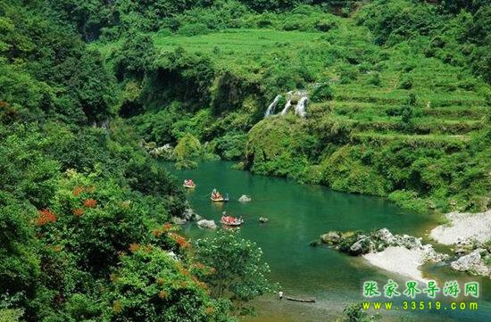 天下第一漂,起點(diǎn)哈妮宮距王村約40公里,行車(chē)1小時(shí),終點(diǎn)牛路河距王村30分鐘的車(chē)程,漂流水路長(zhǎng)17公里,漂流兩個(gè)半小時(shí)。從哈妮宮放舟而下,一路是古老的河道,絕壁百里,怪石嶙峋,灘奇水異,兩岸蒼翠的林木,云霧繚繞,飛瀑流泉與溶巖峰林交相輝映。拐一百五十五個(gè)彎,在一百三十三個(gè)灘潭中穿梭而行,迂回流連,馳魂奔魄,心曠神怡。