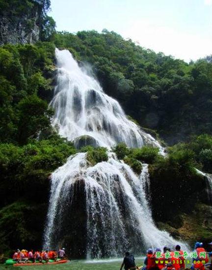 瀑布高200多米,上窄下寬,活似從天邊撒下的一具銀線(xiàn)網(wǎng)。是猛洞河最大的瀑布。它是一條水量豐富的小河,在此處突然失去河床的依托,水流飛奔直下,臨空跌落到底下的陡坡上,然后呈弧行展開(kāi),直飛到司河。此瀑布近觀滔滔、涸霧朦朧、凌空習(xí)墜、漫天飛珠,奔騰直下。流水傳說(shuō),這里原來(lái)沒(méi)有瀑布,只是一山石壁高聳藍(lán)天。壁下只有這具隋園形澄潭。古時(shí)候,潭中魚(yú)妖成群,作惡多端,其中一黑魚(yú)妖,每每掀翻船筏,攬人落水,以供餐食,據(jù)說(shuō)在這里翻船破筏的人落水后沒(méi)有一個(gè)人能出來(lái)。人們苦叫這里為落水坑,年復(fù)一年,人們無(wú)奈,求上天保佑,于是玉皇派觀音下塵明查,查知黑魚(yú)作祟便揮手出線(xiàn),招手成網(wǎng),一句咒語(yǔ),黑魚(yú)妖落入網(wǎng)中,為了讓世人咄言黑魚(yú),便將黑魚(yú)掛在石壁之上,遺臭萬(wàn)年。觀音走后,魚(yú)網(wǎng)變成了這個(gè)大瀑,故名落水坑瀑布?,F(xiàn)遠(yuǎn)觀瀑布還可看到淹留在瀑內(nèi)的黑魚(yú),隱隱約約在流水下閃動(dòng),那情景象是在緩緩向上游呢。