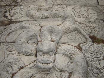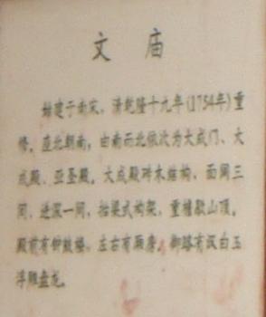 廟前面有學(xué)宮坪,亦名學(xué)坪,坪南端有大明壁。廟宇紅墻黃瓦,氣勢宏偉。正門曰奎星門,前院左右各植檜樹,常年翠綠,散發(fā)幽香??情T內(nèi)有月形泮池,池周護(hù)以石欄。泮池附近有石坊三座,正南石坊匾額鐫有“斯文在茲”四字,東西兩坊貫通街衢。通過石坊便是大成門。進(jìn)門左右是飛檐綠瓦的鐘鼓亭。大成門通向大成殿,有石鋪甬道直抵大殿臺(tái)基。臺(tái)高一米,全系石塊疊成。臺(tái)階分左右兩道,中有石雕盤龍,綴以云海波濤,栩栩如生,躍然石上。大成殿為歇山式重檐結(jié)構(gòu),周圍有16根圓石柱,內(nèi)外枋、檁、藻井、斗拱、扇梧均五彩施繪,黃瓦飛檐,蔚為壯觀。殿后有亞圣殿,與大成門、奎星門前后襯應(yīng),更顯出大成殿主體的雄偉。