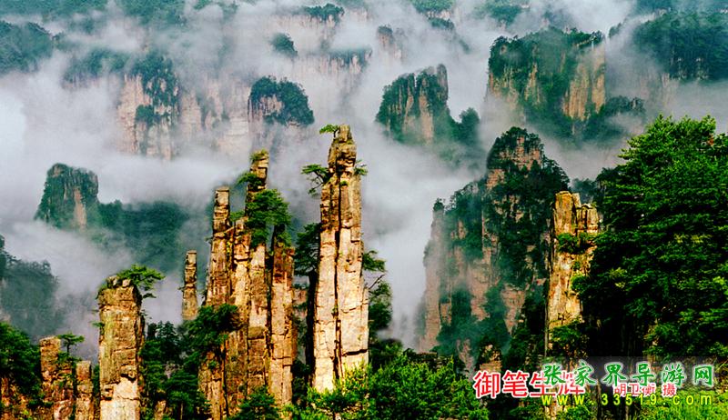眼前這幾支細(xì)細(xì)瘦瘦的山峰,好像一支一支、一節(jié)一節(jié)地從這個(gè)峽谷中長出來的一樣,形狀很像一排倒插在筆筒中的毛筆。筆尖、筆桿可以分得清清楚楚,尤其是頂部一些不大不小的松樹,剛好像是毛筆的筆毫!這簡直就是出自能工巧匠之手!山長成這樣子多么不容易啊,它經(jīng)過億萬年流水切割、風(fēng)雨侵蝕、重力崩塌等多種復(fù)雜的地質(zhì)作用才最終形成。除了大自然,誰有這樣的匠心和耐心,對堅(jiān)硬如鐵的石英紗巖進(jìn)行這樣的精雕細(xì)刻?有人說,張家界如詩如畫的風(fēng)景,就是這幾支筆以青山綠水為線條,以風(fēng)花雪月為色彩,以時(shí)間空間為畫紙畫出來的。