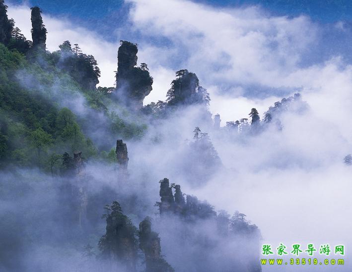 天子山還有云霧、月夜、霞日、冬雪四大奇觀。云霧,是天子山最多見的天象奇觀。有云霧、云海、云濤、云瀑和云彩等景象。久雨初晴之后或霏霏 細(xì)雨之中,先是朦朧大霧,繼而形成白云,環(huán)繞飄浮。群峰在無邊無際的云海中時(shí)隱時(shí)現(xiàn),使人仿佛置身于蓬萊仙境之中。有時(shí)云霧從溪口涌出,爬過峰頂, 然后以鋪天蓋地之勢,飛瀉而下,形成云瀑,十分壯觀。月夜,當(dāng)月明星稀,萬籟俱寂時(shí),這里的峰林被朦朧月色披上了一層“魔紗”,似一群群魔影聳立在幽谷之中。耳聞禽獸嚦嚦的叫聲,使人產(chǎn)生一種神秘感。霞日,晴天的早晨,一輪紅日在朵朵紅云的襯托下,從奇山異峰中冉冉升起。千萬座石塔,婷婷玉立,披上一層紅霞,十分迷人。 冬雪,入冬,天子山銀裝素裹,青松和峰頂被大雪復(fù)蓋。此時(shí)的天子山冰柱倒立,冰花四散,只有一些山鹿 、野豬,才不為銀白世界所征服。