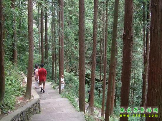 這一大片杉樹林是由張家界國營林場(張家界國家森林公園的前身)工人們種植的。過去“大煉鋼鐵”運動,差點把張家界的山頭全部變成了光頭。后來,一些林場工人抱著“頭發(fā)白在張家界,牙齒掉在張家界,死了埋在張家界”的決心,“獻(xiàn)了青春獻(xiàn)終身,獻(xiàn)了終身獻(xiàn)子孫”,發(fā)誓要植樹造林,綠化張家界。幾十年過去了,許多人綠了青山白了頭,他們的心愿終于變成了眼前的現(xiàn)實。腳下這條彎彎曲曲而又平平整整的游道是20世紀(jì)80年代修建的。漫步其上,山風(fēng)陣陣、鳥雀聲聲、奇花朵朵,群峰在樹林中若隱若現(xiàn),很有“蟬鳴林逾靜,鳥鳴山更幽”的幽靜與“采菊東籬下,悠然見南山”的悠然。