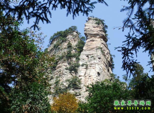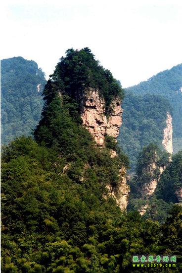 兩支山峰圍成一道天然小石門,大有“一夫當(dāng)關(guān),萬夫莫開”之勢,人稱南天門,據(jù)說過了這道門就是天堂。不過,說來也奇怪,穿過山門之后,山勢為之一變,奇峰怪石,蒼松翠柏,美不勝收,不是天堂,勝似天堂。前面這支位于南天門身邊高200多米的孤立石峰,叫南天一柱。它與一般的山峰不大相同,一般的山峰是下面粗、上面細(xì),而它是上面粗、下面細(xì)。山風(fēng)吹來,這根石柱好像搖搖欲墜,驚心動魄之余,仿佛耳邊還能隱隱約約聽到億萬年前地殼運動時發(fā)出的轟隆隆的巨響——為了“安全”我們還是繼續(xù)往前走吧。