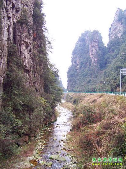 百丈峽是武陵源風(fēng)景名勝區(qū)通往張家界市的公路貫通整個(gè)峽谷,因有堵高近百丈的石壁,直插云霄,不敢仰視,故而得名。據(jù)《慈利縣志》載,索溪峪右得百丈峽,峽長三十公里……又相傳向王天子起義軍與官兵在此先后博殺一百仗,依此又名百仗峽。明代九永兵備胡桂芳,一生好游歷山川,來到百丈峽后題寫了一首七言詩:“峽高百丈洞云深,要識(shí)桃源此處尋;戎旅徐行風(fēng)雪緊,誰將興盡類山蔭。”刻于峽內(nèi)道旁石壁上。