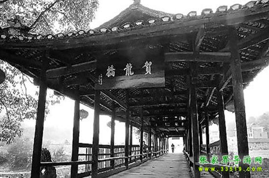 賀龍橋原稱“永安橋”。飛架于賀龍故居右側玉泉河上,是一座石墩、木粱、騎廊的風花橋。東西長40米、寬7米、高8米。龍爪翹檐,中聳堡亭,8尊石獅,分置橋頭及石墩之上,造型渾厚古樸,富有民族特色。此橋原是溝通桑植內外半縣的必經之道,是上川鄂下津澧的要津,也是當年鹽局奪槍、桑植起義的發(fā)端處。系賀龍曾祖父賀廷宰首倡捐資修建,幾番修而復圮。至1916年,終由賀龍父親賀仕道襄修告竣。1929年冬,桑植“剿共”司令陳策勛,謂以破“賀氏風水”,令毀此橋。解放后,桑植縣人民政府于1952年冬按原樣復修,命名“賀龍橋”。“文化大革命”動亂中,林彪、“四人幫”誣陷賀龍,指使“紅衛(wèi)兵”毀橋,群眾奮起護衛(wèi),才幸免劫難。1983年5月,賀帥女兒賀曉明應縣政府請求,得全國書法家協(xié)會秘書長謝德萍書匾“賀龍橋”,高懸橋之東西首,永志紀念。1978年,賀龍故居及其生平業(yè)績陳列室、賀龍橋,列為省級重點文物保護單位。凡到賀龍故居、賀龍紀念館的游客這是必經之地。
