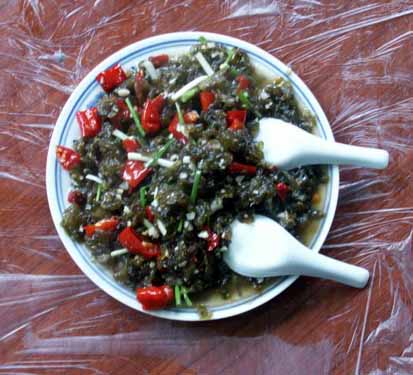 【 酸辣子炒沙蘿菇 】 當地春夏季雨后,山頭巖石壁上生長的墨綠色地菇——地衣(本地名為沙蘿菇),采集后用清水反復多沖洗幾次。再用壇子腌的酸辣椒和大蒜一起炒熟,出鍋后灑些許香蔥即成一道色、香、味俱全的地方特色小吃。