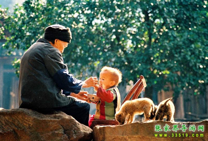 孩子們自從娘胎里出來,父母們就給備好了一首首童謠。在襁褓中時,有簡短的搖籃曲。“我的小寶貝,睡吧快快睡,你莫哭,快長大,我的小寶貝”,伴以“喲嗯”之類的喉音和鼻音??摁[的孩子在這低低的吟哦中,在這輕柔的春風中,會緩緩的走入夢鄉(xiāng)。到孩子牙牙學語時,就會換上新的內(nèi)容。為讓孩子從小懂得廉恥,大人會教孩子《蟲蟲兒飛》:“打板板,逗蟲蟲兒,蟲蟲兒飛,飛到嘎兒(外公)去。嘎兒不趕狗,咬到蟲蟲兒的手;嘎兒不殺雞,蟲蟲兒不回去;嘎兒不打蛋,蟲蟲兒不吃飯;嘎兒不殺鵝,蟲蟲兒不過河。”(土家把孩子名字叫得賤,喊成“蟲蟲兒”)。在唱的同時手把手地教孩子做蟲蟲飛的動作。唱完后,又會用手指點點孩子的左右臉,刮一下孩子的鼻子,“這兒也丑,那兒也丑,鼻子刮豬油。”意思是好吃是丟臉的,蟲蟲兒可不能這樣。勤勞是做人的根本,也是土家人的傳統(tǒng)美德,“三歲看大,八歲看老”,大人會教些勤勞的童謠。《賣豆腐》道:“一顆豆子圓又圓,推成豆腐賣成錢,別人講我生意小,小小生意賺大錢。”為讓孩子自小懂得親疏,教孩子《推磨》:“推磨拐磨,推的粑粑白不過。推粑粑,接嘎嘎,嘎嘎不吃娃娃的酸粑粑;推豆腐,接舅舅,舅舅不吃娃娃的酸豆腐;推合渣,接姨媽,姨媽不吃娃娃的酸合渣……”夏日的夜晚,一家人出來在月亮地里歇涼,有夜火蟲(螢火蟲)舉著火把飛來,母親會以夜火蟲打頭,以“一問一答”的聯(lián)句方式,考考孩子的記憶力:“夜火蟲,夜夜來,嘎婆接你吃茶來。什么茶?豆茶。什么豆?黃豆。什么黃?朱砂黃……”