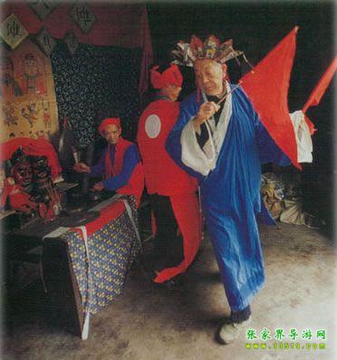 儺戲在湘西土家族地區(qū)也稱儺堂戲、儺神戲,它與土家族原始巫教、巫術(shù)的關(guān)系極為密切。土家族先民信奉的神有儺神、八部大神、土地神等,作為一種宗教活動(dòng),這種原始信仰與社會(huì)生產(chǎn)活動(dòng)、文娛活動(dòng)及民族習(xí)俗是融為一體的,因此儺戲最先的“沖儺還原”帶有明顯迷信色彩,土家族群眾中有“一儺沖百鬼,一愿了千神”的說法,湘西土家族人干脆叫它為“神戲”。湘西土家族儺戲的發(fā)展過程大體是儺、儺舞、儺儀然后才產(chǎn)生儺戲。儺舞源于久遠(yuǎn)的蒙昧?xí)r期,土家先民們?cè)谕笞匀蛔鞫窢?、同毒蟲猛獸作斗爭,便產(chǎn)生了化裝護(hù)面、在鼓樂聲中奔騰呼號(hào)、沖殺跳躍的原始儺舞,其所模擬的鳥雀舞、猿猴舞、熊舞等頗為壯觀。儺舞與儺這種驅(qū)鬼消災(zāi)的祭祀儀式結(jié)合后,增加了祈求人獸平安、五谷豐登、緬懷祖先、勸人去惡從善、以及傳播生產(chǎn)知識(shí)等內(nèi)容,這就逐漸形成了兼?zhèn)潢U弘教義及娛樂性質(zhì)的祭祀風(fēng)俗歌舞。[2]土家族儺戲就是在此基礎(chǔ)上發(fā)展起來的。部分土家族學(xué)者認(rèn)為土家族儺戲的遠(yuǎn)源可以追溯到戰(zhàn)國時(shí)代的《九歌》,《九歌》是土家族儺戲的雛形,他們的依據(jù)是當(dāng)時(shí)楚國的沅湘流域,人們“信巫鬼、重淫祀”(《漢書·地理志》),從而使得“陰陽人鬼之間,又或不能無褻慢淫荒之雜”(宋代朱熹《楚辭集注》)。屈原正是加工整理了這一類“鄙陋”之詞,才創(chuàng)作出《九歌》、《天問》等名篇。也有部分學(xué)者不贊同這種論點(diǎn),他們認(rèn)為土家族儺在宋代還停留在儺祭和儺舞階段,最遲到明代,土家族儺才發(fā)展成為儺戲[3]。嘉靖《常德府志》記載:“歲除,歲將盡數(shù)日,鄉(xiāng)村多用巫師,朱裳鬼面,鑼鼓喧舞竟夜,名曰還儺。”文中未點(diǎn)明“儺戲”二字,但卻使用了“還儺”一詞,這與今天民間對(duì)儺戲的稱呼相似。又據(jù)清乾隆《永順縣志》載:“永俗酬神,必延辰郡巫師唱演儺戲,……至晚,演儺戲。敲鑼擊鼓,人各紙面一,有女裝者,曰孟姜女;男扮者,曰范七郎。”在土家族儺戲中,孟姜女傳說故事占著非常重要的地位。在湘西土家族地區(qū),儺戲一般有二十四正戲,即二十四戲神。每次儺儀結(jié)束時(shí),巫師要用香火在黃裱紙上燒二十四個(gè)洞,以表示奠祭二十四戲神。民間有諺語:“儺神菩薩不識(shí)字,只要二十四個(gè)圈圈滿。”在二十四儺神中,被稱為勾愿神的姜女、范郎是還儺愿時(shí)非常重要的兩位神靈。在儺戲中,《孟姜女》是整場(chǎng)的高潮,平時(shí),儺戲唱完后,由沒下裝的孟姜女、范郎去向主人家及觀眾“拜臺(tái)”,以示“了愿”。清代中期以后,儺戲吸取了花燈、陽戲、高腔等其他地方戲劇劇種的唱腔和劇目,逐漸變得日益成熟。我們仔細(xì)查看了全國371個(gè)劇種,發(fā)現(xiàn)儺戲、花燈戲有著相同的班社,也就是說一個(gè)演出班社可以演出儺戲、花燈戲兩個(gè)劇種。這段時(shí)期,儺戲已作為獨(dú)立戲劇劇種參加演出。由于儺戲是由巫儺法事演變而成的戲劇形式,經(jīng)歷著巫儺法事(驅(qū)鬼祭祀)、儺壇上戲和儺堂正戲的發(fā)展過程。