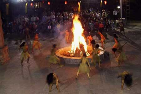 擺手舞的形式一般是這樣的:在擺手堂的中央高掛龍旗,四方點(diǎn)燈,由金童玉女給土家人用銅盆洗手,再?gòu)南慊鹕饺砩窕穑缓笤邶埰煜曼c(diǎn)燃3堆篝火。隨著3聲炮響,先由梯碼法師(巫師)手舉八寶銅鈴作前導(dǎo),大家跟著翩翩起舞,徹夜不眠。