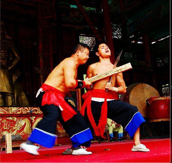 大庸氣,堪稱武林奇葩,曾為祖國贏得聲譽,海內外享有極主名望。 大庸氣功是大庸各民族特別是土家族傳統(tǒng)體育項 目之了,分健體氣派、武術氣功兩類。前者有“返還 功”、“馬王推氣功”、“少林達摩醫(yī)療保健氣功” 等;后者有靜坐、壁虎、靈子、二指彈、碎石、松靜 、硬氣、五禽、五陽功等,尤以硬氣功著稱。大庸硬 氣功,歷史悠久,漢代相單程,明代覃后,清代劉明 燈,當代湯子模、周鐵鞭、杜心武、趙繼書等都具有 超人硬氣武功。大庸土著民族在漫長的反征服、反壓 迫斗爭,博采武當、少林南北派、昆侖派眾家武林精 華,創(chuàng)造出獨此一家的大庸硬氣功。 據(jù)傳,大庸硬氣功鼻祖是楚國鬼谷子。《永定縣 志》有關鬼谷子隱居天門山鬼谷洞潛心學《易》、傳 授方術的記載。到清代有武林高手朱茂嶺,隱居三岔 村北芭蕉灣洞,研究鬼谷氣功之術,后收西溪坪胡口 子、余世萬(即“余通人”)為徙,傳其衣缽。余通 人將武術氣功系統(tǒng)整理,發(fā)揚光大,播名于世。 新中國成立后,黨和政府十分重視民間氣功發(fā)掘 整理,并正式列為體育項目加以普及發(fā)展,今日大庸 市習練硬氣功達數(shù)萬人眾。永定區(qū)官黎坪村世有“硬 氣功之鄉(xiāng)”盛譽,該村男女老幼,練功已蔚成風氣, 其武師趙繼書,1979年先后參加全省和全國武術大賽 ,均獲一等獎,受到國家體委重視,同年7 月趙繼書 專程到北京給中央領導同志匯報表演。嗣后,隨同中 國武術代表團和國家領導人先后兩次出國,到盧森堡 、意大利、比利時、羅馬尼亞、馬其他和東南亞等國 家訪問。他表演的臥刀碎石、頭頂開石、雙鳳灌耳、 頭碰石柱、叉尖推磨等精彩節(jié)目,博得外國友人好評 。盧森堡一位榮獲國家獎牌的武士,看了表演后連夜 來到中國大使館,將自己珍藏多年的獎牌贈送給他; 盧森堡國王主動熱情走上臺與趙繼書熱情擁抱,連連 稱贊:“了不起!了不起!國際氣功大師!”并把珍 藏紀念章一枚贈送給趙繼書。一位法國朋友十分贊賞 說:“中國的氣功,稱為全人類的寶貴財富,是有科 學道理的。”自此,大庸硬氣功譽滿全球。湖南瀟湘 電影制片廠專門拍攝了彩色紀錄片《大庸氣功》。 大庸硬氣功共有二十多個項目,最有影響的是: 腹臥鋼叉 由二人在地面扶住一根叉尖朝上的三 股鋼叉,叉尖猁鋒利,然后一個俯身叉尖,尖抵腹部 ,待其四肢平展懸空,扶叉二人轉動鋼叉,謂之推磨 。表演時,要求臥叉者運氣于腹,氣意集中,稍有大 意,叉即穿腹而過。 臥刀破石 先固定兩把大刀,刀口朝上,臥刀者 運氣后,由其他人抬臥于刀口上(有仰臥、俯臥兩種) ,然后在臥刀者腹部或背部置一碩大石條(約數(shù)百斤) ,一人或兩人輪大鐵錘狠擊石條直至斷裂破碎為止。 釘?shù)洞财剖?地上倒一層碎玻璃片,一人仰臥其 上;然后腹上置釘床,又一人仰臥釘床上,再于第二 人腹上置釘床,第三人仰臥刀床上,腹部上壓一塊數(shù) 百斤大條石,由人掄錘狠砸,至石破為止。 銀槍刺喉 用一根兩頭安有鋒利槍頭的鋼槍,抵 置兩位表演者喉部,然后相對發(fā)力,至槍桿抵成彎弓 形而喉部安然無恙。 徙手斷石 表演者將堅滑如鐵一塊卵石置于石凳 (地)上,然后運氣于掌或指擊斷(碎)卵石。 踢腿斬石 表演者運氣于腿,以腿踢斷石條。一 般可踢斷15公分以上厚度的麻石條或青石條。 胸部打刀 將鋒利大刀刃口置于胸部肌肉上,用 一根拳頭粗木棒猛擊刀背,至棒斷而胸部無傷。 新中國成立以來,大庸民間武術與民族體育逐漸 融為一體,發(fā)揮著提高人民身體素質、弘揚中華武術 傳統(tǒng)和增進國際友誼重大作用。除硬氣功外,還有數(shù) 十種武術形式散見于民間武術體育活動之中。如打飛 棒、扭扁擔、抵搭斗杠、擠油渣、甩抱腰、舉石鎖、 板牛角(一種斗牛形式)等等。其特點是因地制宜, 不分場地,凡田園地角院壩集鎮(zhèn),都是習武練功、開 展活動的處所,頗具泥土氣息。擬或以生活中某些動 作和動物的某種形態(tài),稍加模仿演繹,便成某一獨特 武術形式。如天門武術功夫大師余道人所創(chuàng)造的“宮 天梳”、“巖燕樸天門”等;也有就地理特點創(chuàng)造某 種武功形式的,如“蕩藤”等。
