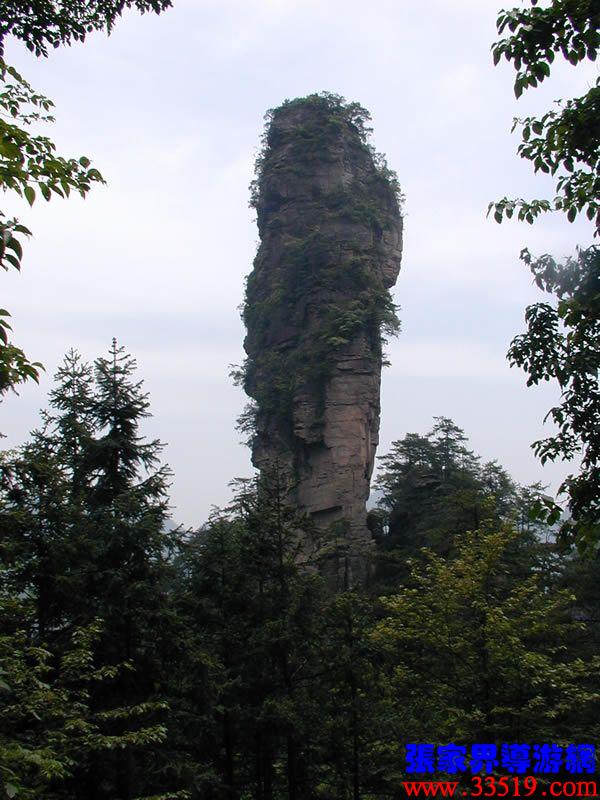 (南天一柱)現(xiàn)在我們前方幽谷峰林中有一高達(dá)200多米的孤峰,宛如擎天玉柱。上部灌木點綴,中部巖身赤裸,下部樹木遮掩,峰體渾圓、偉岸,因立南天門下而得名。