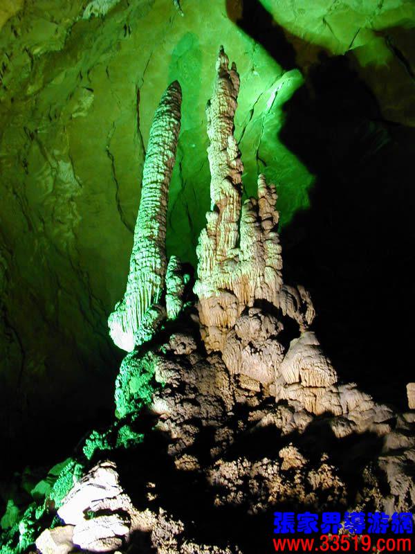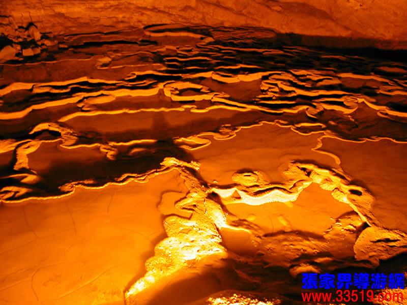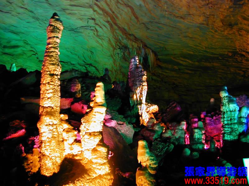 (龍宮)龍宮是黃龍洞十三個大廳中最大的一個,也是景色最美的景點(diǎn)之一,底面積15000平方米,平均高40米,兩千余根石筍拔地而起,千姿百態(tài),異彩紛呈,或如飛禽走獸,或如宮廷珍藏,有的像巍巍雪松,有的像火箭升空。龍宮后園有金銀兩座花池,清水常溢,花簇盛開。宮頂鐘乳柳垂簾掛,四周壁畫栩栩如生。溶解著各色各樣的礦物質(zhì)的水,從巖層中滲透出來,滴落下來。礦物質(zhì)在洞頂凝固結(jié)晶成倒懸鐘乳石,從鐘乳石滴落的水又把礦物質(zhì)澆疊、堆壘在洞底,而長成節(jié)節(jié)向上的石筍。大家看看這龍宮的造型,領(lǐng)略這磅礴的氣勢。洞內(nèi)最大石筍,高12米、直徑10米的漢白玉天然石椅“龍王寶座”居高臨下,眾多石柱石筍似人似物,維妙維肖,圍著寶座朝拜山呼,幾十座珊瑚亭亭玉立,儼然一支龐大的“宮廷樂隊”。湖南著名教授羊春秋先生作《寄生草》詞對此進(jìn)行描繪:“百態(tài)千姿模樣,三宮六院門巷。龍王開宴設(shè)瓊漿,猴王偷果鬧天堂,君王納寵擁羅帳。搬演了人間爭攘,匯集了天下奇觀。”
