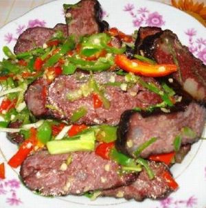 介紹: 血豆腐,就是將豆腐和豬血、豬肉及花椒、辣椒等佐料拌成泥狀,捋成卵形,以竹篩置火炕上,煙熏烤成臘黃,吃起來耐嚼味香,是土家特色菜,當(dāng)?shù)厝顺R云湎戮啤?在張家界的飯館里很難吃到正宗的土家特色菜,可以去做土味的特色餐館去解解饞。但是最正宗還是鄉(xiāng)下人家家里自己熏的,那才叫一個好吃!?。?/p>