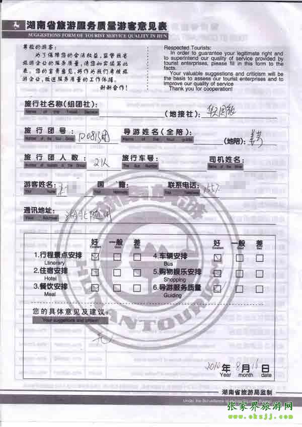 2010年8月16日湖北王先生一行21位旅游質(zhì)量反饋