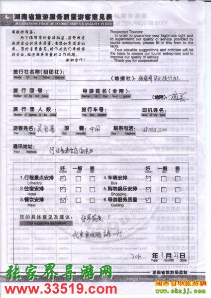 2010年3月21日河北吳小姐張家界旅游質(zhì)量反饋
