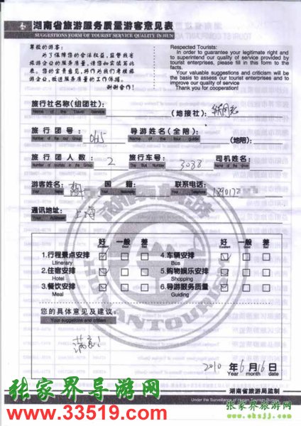 2010年6月16日上海陶先生一行2位旅游質(zhì)量反饋