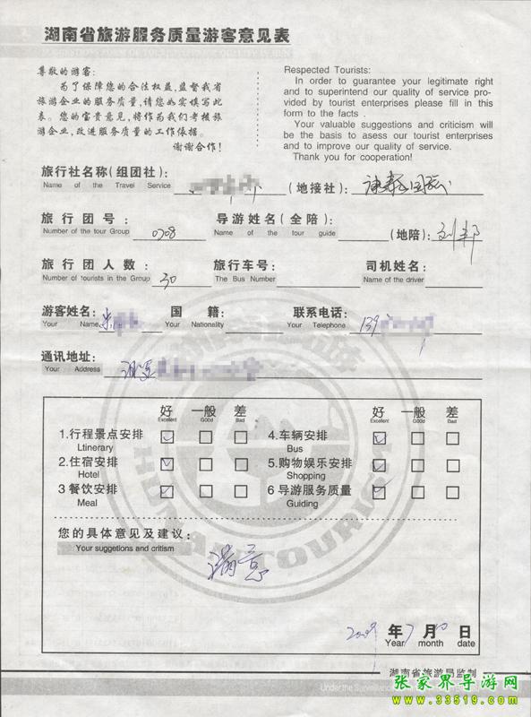 2009年7月8日汨羅朱先生一行30人質量接待反饋單: